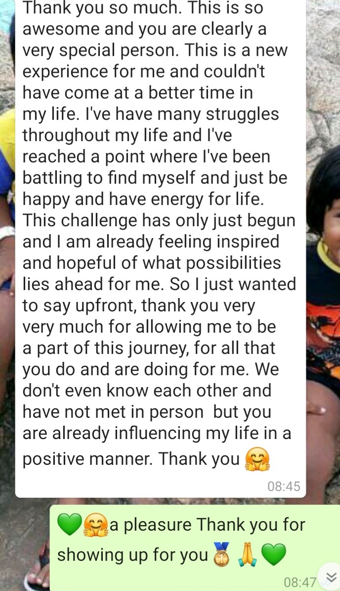 I deeply recommend that if you sign up, that you participate fully. Attend the online (Whatsapp) group connection sessions. Do the work. Be open. Be teachable. Be willing to learn. Share honestly. Our group did, and we are still connected post end of the course – communicating regularly. The honesty and gifts that came from sharing and learning through each other is magical and indescribable!